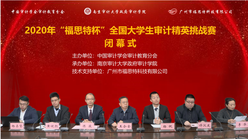 在大賽閉幕式環節,南京審計學院教務委員會許漢友副處長主持了閉幕式,中國審計學會、審計教育分會副會長兼秘書長、南京審計大學黨委副書記、副校長王會金,廣州市福思特科技有限公司總經理楊帆,南京審計大學政府審計學院執行院長陳駿,德勤事務所高級經理黃健聰,南京審計大學政府審計學院實驗中心主任李華,南京審計大學政府審計學院楊柔堅等領導出席了閉幕式。