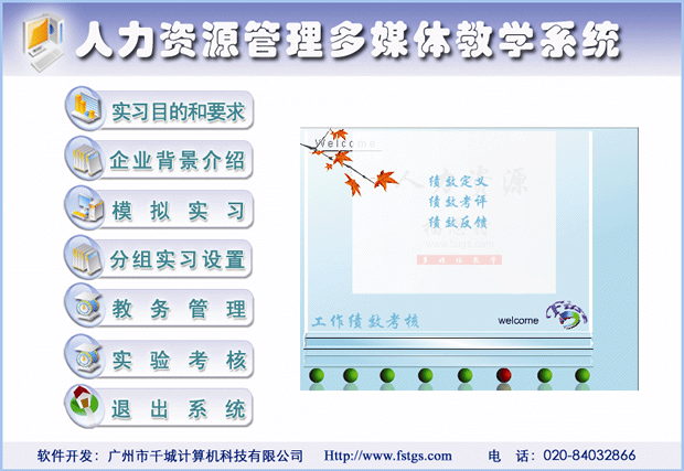 人力資源管理是一門實踐性和藝術性都很強的學科,而在傳統的人力資源管理教學過程當中,常把人力資源管理分成工作分析、人力資源規劃、招聘、培訓、薪酬管理、績效考評、勞動關系等幾個獨立的模塊,老師在課堂上講授書本理論,很難把人力資源管理的各個業務流程、過程控制與企業實際運作結合起來。導致學生畢業后對人力資源管理的內容、運作依然模糊不清,在現代企業的人力資源管理工作崗位上,難以學以致用,無法適應企業的人才需求。因此,在教學中怎樣把理論和實際結合起來,給學生提供較為真實的模擬實習環境,提高學生的人力資源管理業務操作能力,為企業提供實用的人力資源管理人才,是當前人力資源管理教學中亟待解決的一個重要問題。為了解決上述問題,廣州市福思特科技有限公司組織專家學者成功地研制出《人力資源管理多媒體教學系統》。