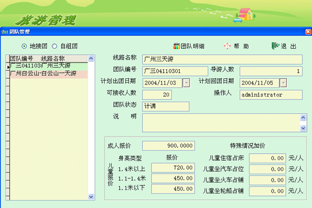 4.團隊計調模塊。團隊計調主要分為團隊操作和計調操作兩大部分,在形式上分為地接團操作和自組團操作兩種。在團隊操作中主要通過“團隊明細”顯示團隊信息。團隊信息包括線路日程安排、團隊報價、團隊報名信息、團隊計調狀態。在計調操作中主要分為訂房、訂車、訂餐、訂票、分配導游等操作過程。以上各操作過程中計調人員可以通過信息庫來查找自己想要的信息。