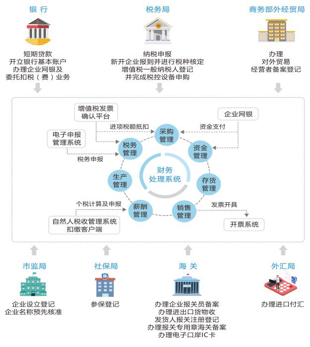 軟件包含:財務處理系統、電子申報管理系統、增值稅防偽開票系統、稅務局、銀行、人社局、市監局、自然人稅收管理系統扣繳客戶端、企業檔案庫、其他實體模塊。